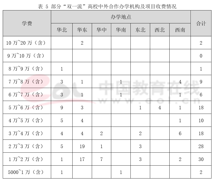 從中外合作辦學(xué)項(xiàng)目分配區(qū)域來看,華北、華東區(qū)域中外合作辦學(xué)項(xiàng)目學(xué)費(fèi)相對較高。從合作院校及專業(yè)上看,國外院校排名靠前的學(xué)費(fèi)較高、新型熱門專業(yè)學(xué)費(fèi)較高。