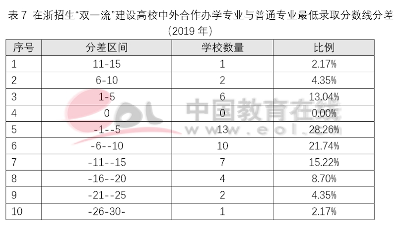 由于中外合作辦學(xué)項(xiàng)目或機(jī)構(gòu)收費(fèi)相對高昂,在招生的錄取分?jǐn)?shù)上,多數(shù)中外合作辦學(xué)項(xiàng)目錄取分?jǐn)?shù)線都低于非中外合作辦學(xué)項(xiàng)目。但差距在逐漸縮小,以浙江省為例,2019年在浙江招生的“雙一流”建設(shè)高校中共有46所有中外合作辦學(xué)招生專業(yè)(中外合作辦學(xué)機(jī)構(gòu)和項(xiàng)目專業(yè),不含獨(dú)立法人機(jī)構(gòu)),專業(yè)最低錄取分?jǐn)?shù)線和普通專業(yè)最低錄取分?jǐn)?shù)線差值為-30到12分之間,超過普通專業(yè)錄取分?jǐn)?shù)線的共有9所高校,占總數(shù)的20%,主要集中在華東和北京地區(qū);有50%的高校合作辦學(xué)專業(yè)最低錄取分低于普通專業(yè)10分以內(nèi)。專業(yè)錄取分差最大的兩所高校,分別是人民大學(xué)蘇州校區(qū)和北京交通大學(xué)威海校區(qū),主要原因是辦學(xué)項(xiàng)目不在北京主校區(qū),而在江蘇蘇州和山東威海。說明考生和家長報(bào)考時(shí)除了考慮學(xué)費(fèi)問題還會關(guān)注校區(qū)問題。
