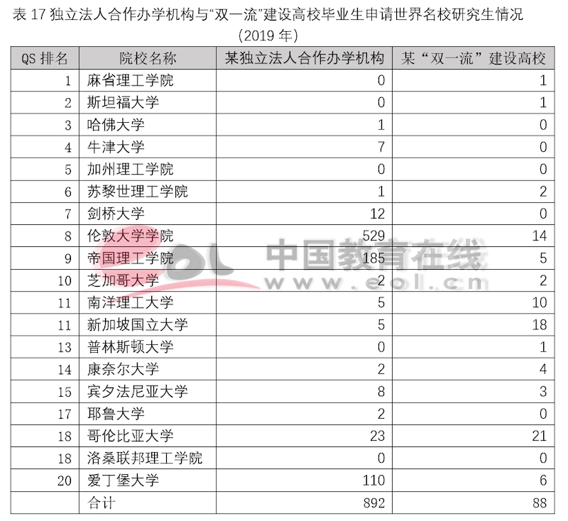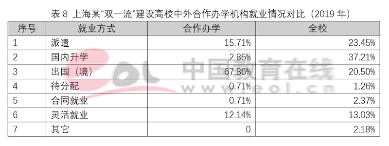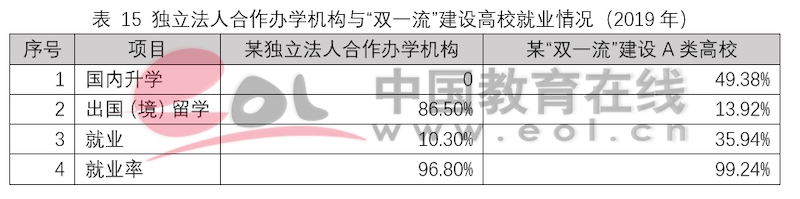 獨(dú)立法人中外合作辦學(xué)機(jī)構(gòu)設(shè)立之初的目標(biāo)就是引入優(yōu)質(zhì)國際教育資源,高水平示范性發(fā)展,培養(yǎng)高質(zhì)量國際化人才。和非獨(dú)立法人中外合作辦學(xué)機(jī)構(gòu)與項(xiàng)目一樣,獨(dú)立法人合作辦學(xué)機(jī)構(gòu)畢業(yè)生在出國深造上具有顯著優(yōu)勢。以2019年某獨(dú)立法人合作辦學(xué)機(jī)構(gòu)和某“雙一流”建設(shè)A類高校2019年就業(yè)和出國深造數(shù)據(jù)為例,可以看出,獨(dú)立法人合作辦學(xué)機(jī)構(gòu)的畢業(yè)生選擇出國(境)深造的比例要遠(yuǎn)高于普通高校,并且在申請海外名校深造時(shí)更受青睞。