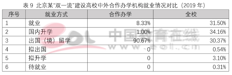 中外合作辦學(xué)項(xiàng)目或機(jī)構(gòu)畢業(yè)生出國留學(xué)通常會選擇繼續(xù)申請本項(xiàng)目合作高校或合作高校所在國別高校繼續(xù)深造,或者選擇申請國外其它知名院校。表9中北京某“雙一流”建設(shè)高校中外合作辦學(xué)機(jī)構(gòu)畢業(yè)生2019年繼續(xù)選擇合作院校碩士項(xiàng)目的學(xué)生比例為56.6%,申請其它國(境)外高校的學(xué)生比例為34%。其中申請到世界排名前20高校的學(xué)生占比為21.57%,申請到世界排名前50高校的學(xué)生占比為48.04%。