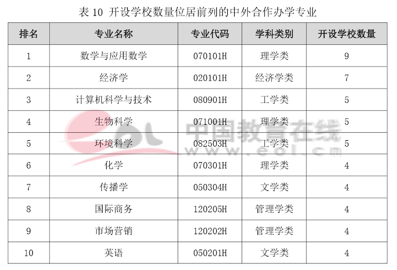 下表列出了“雙一流”建設(shè)高校中外合作辦學(xué)開設(shè)學(xué)校最多的前10個(gè)專業(yè),其中位居前三的分別是機(jī)械設(shè)計(jì)制造及自動化專業(yè)、金融學(xué)專業(yè)、土木工程專業(yè),此外電氣工程及其自動化專業(yè)、計(jì)算機(jī)科學(xué)與技術(shù)專業(yè)開設(shè)學(xué)校數(shù)量也位列前茅,反映出當(dāng)前我國經(jīng)濟(jì)社會發(fā)展對于這些專業(yè)技術(shù)人才需求的增長。