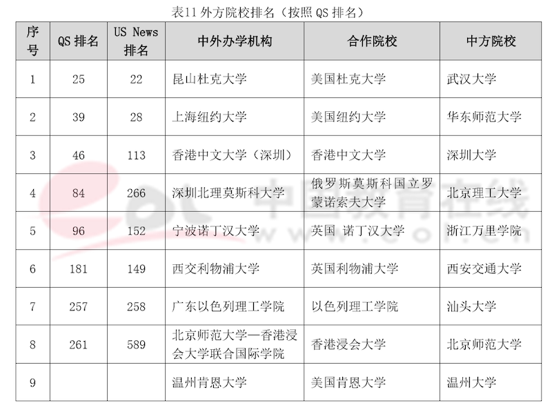 這9所獨(dú)立法人中外合作辦學(xué)機(jī)構(gòu)外方合作院校均是國際知名大學(xué),除溫州肯恩大學(xué)外,其余8所外方合作院校QS排名均在300名以內(nèi)。