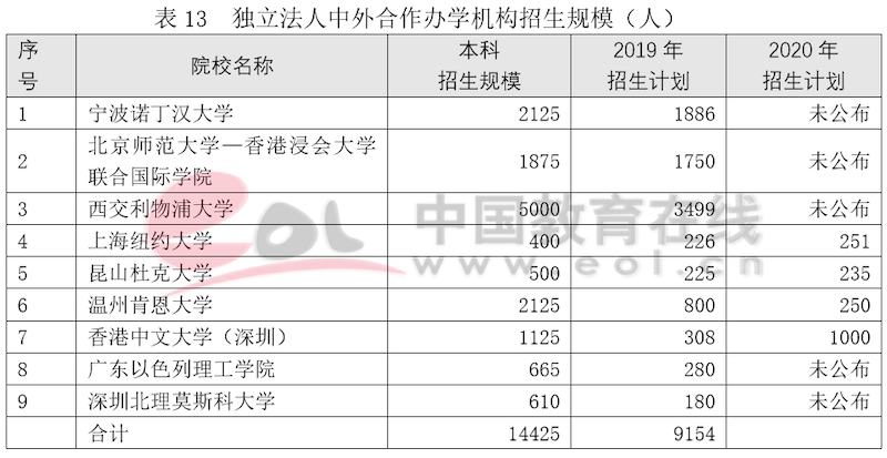 經(jīng)教育部審批,9所獨(dú)立法人合作辦學(xué)機(jī)構(gòu)每期本科招生規(guī)模為14425人,2019年高考統(tǒng)一招生計(jì)劃人數(shù)為9154人(未含國際及港澳臺學(xué)生),2020年4所已公布招生計(jì)劃的獨(dú)立法人合作辦學(xué)機(jī)構(gòu)招生人數(shù)都有小幅上漲。