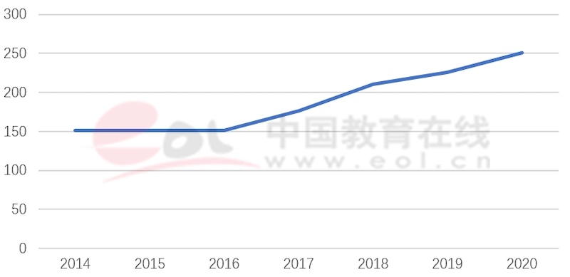 為了保證辦學(xué)質(zhì)量,各中外合作辦學(xué)機(jī)構(gòu)首年招生人數(shù)都小于審批的招生規(guī)模,隨著辦學(xué)的成熟,逐年增加。如圖所示上海紐約大學(xué)招生人數(shù)從2014年的151人,增加到了2020年的251人(未含國際及港澳臺學(xué)生)。