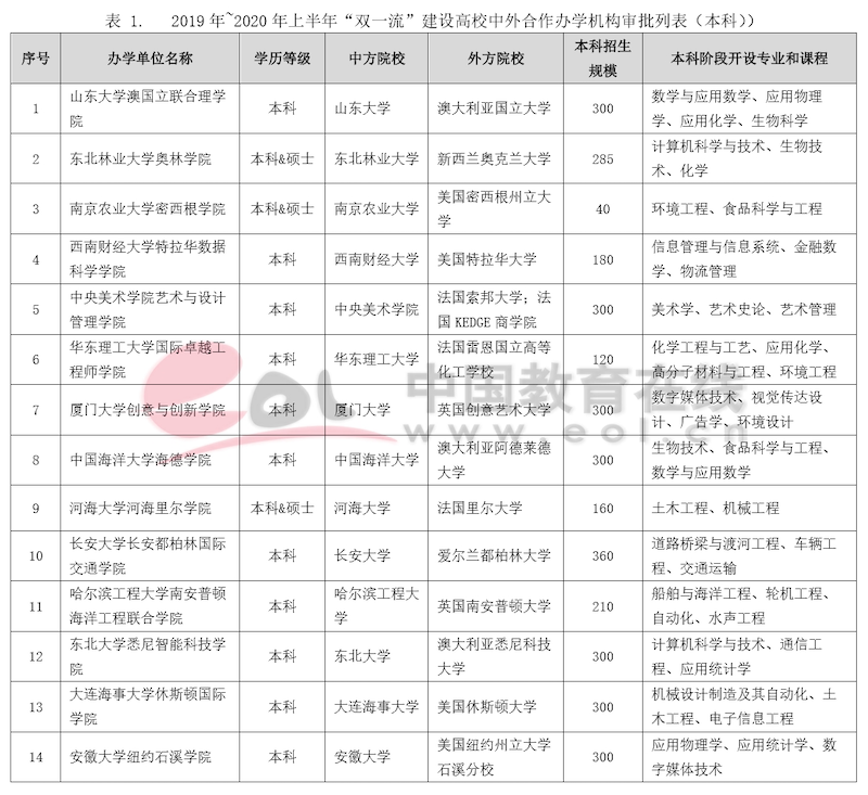 1.2019年~2020年上半年“雙一流”建設(shè)高校中外合作辦學(xué)機(jī)構(gòu)審批列表(本科)