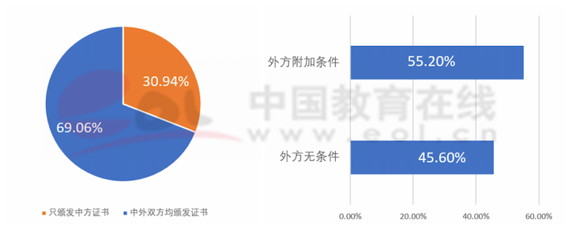 我國“雙一流”建設(shè)高校中外合作辦學(xué)項(xiàng)目的學(xué)位授予情況主要分為兩種:只頒發(fā)中方證書和中外雙方均頒發(fā)證書。外方院校授予合作辦學(xué)項(xiàng)目畢業(yè)生學(xué)位分為無條件(學(xué)生無需前往外方院校就讀)和附加條件(學(xué)生必須前往外方院校就讀)兩種情況。