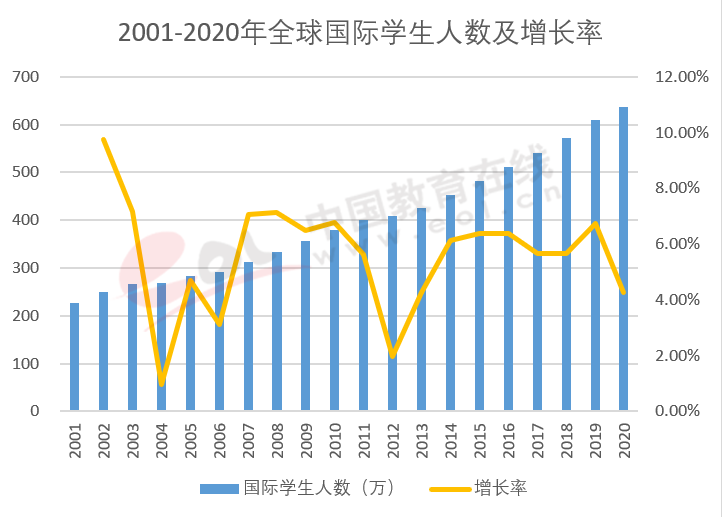 雖然受到國際政治形勢、新冠肺炎疫情以及經(jīng)濟危機等多重因素影響,但在世界范圍內(nèi),跨國間的學(xué)生流動還是保持了近幾十年以來的增長趨勢,國際學(xué)生人數(shù)不斷攀升。如圖表1所示,根據(jù)聯(lián)合國教科文組織(UNESCO)數(shù)據(jù)統(tǒng)計,進入二十一世紀以來,全球國際學(xué)生流動人數(shù)由2001年的227萬人,增長到了2020年的636萬人,二十年間增加了409萬人,增長了接近兩倍。但在“逆全球化”背景下,2020年增長率下降了2.5個百分點,增速放緩,在連續(xù)六年年增長率超5.5%后回落至2014年增長水平。