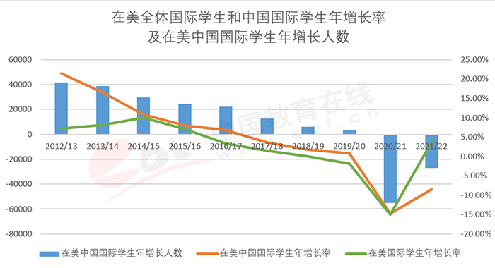 在2020/21學(xué)年之前,中國赴美留學(xué)國際學(xué)生年增長率一直高于全體赴美留學(xué)國際學(xué)生年增長率。在2020/21學(xué)年,雖然中國赴美留學(xué)生人數(shù)同比下降了14.8%,但主要是受疫情影響這一學(xué)年赴美國際學(xué)生整體下降了15%,相較而言,中國的下降幅度和整體是相當(dāng)?shù)?,甚至占國際學(xué)生比例還是最高的一年。但2021/22學(xué)年,在赴美國際學(xué)生整體增長3.8%的情況下,中國卻顯著下降,再次同比大幅下降8.6%(見圖9)。