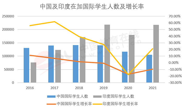 加拿大國際學(xué)生的主要來源地是亞洲國家,近幾年排名前兩位的一直是中國和印度,占到總?cè)藬?shù)的50%以上。2017年以前,中國是加拿大最大的國際學(xué)生生源國,但增長速度放緩,接近停滯。而印度赴加留學(xué)人數(shù)迅猛增長,并在2018年超越中國,成為第一大生源國(見圖10)。2020年,因為疫情原因,加拿大國際學(xué)生人數(shù)相比2019年腰斬,不過中國和印度國際學(xué)生人數(shù)下降比例不到20%,主要減少的為歐洲國家生源。