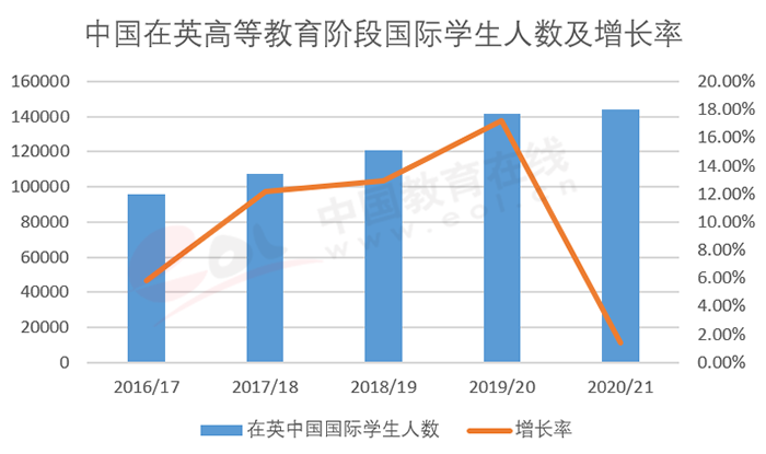 英國高等教育統(tǒng)計局(HESA)的數(shù)據(jù)也顯示,英國對中國國際學(xué)生的吸引力在持續(xù)上升,中國在英國高等教育階段學(xué)習(xí)的國際學(xué)生人數(shù)從2016/17學(xué)年的9.5萬人上漲到2020/21學(xué)年的14.4萬人,增加了接近5萬人,并且在疫情下的2020/21學(xué)年也保持了增長(見圖11)。