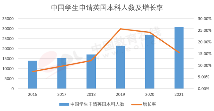 據(jù)英國大學(xué)招生服務(wù)中心(UCAS)統(tǒng)計,2017年后,申請就讀英國大學(xué)本科的中國國際學(xué)生一直保持兩位數(shù)增長,2021年申請人數(shù)進一步上升,首次超過3萬,超過了歐盟國家整體申請人數(shù)之和(見圖12)。由于中國學(xué)生申請人數(shù)增加過于迅猛,申請競爭更加激烈,尤其是名校的申請難度增大。