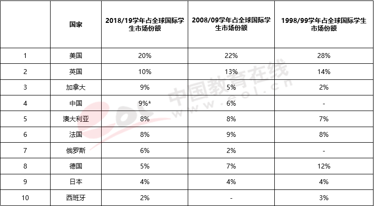 根據(jù)美國國際教育協(xié)會IEE2020年發(fā)布的數(shù)據(jù),國際學(xué)生分布日趨多元。1998/1999學(xué)年世界前五大留學(xué)目的國分別是美國、英國、德國、法國和澳大利亞,分別占據(jù)了全球國際學(xué)生市場的28%、14%、12%、8%、和7%的份額;接下來的二十年里,國際學(xué)生的流動越來越多元,雖然美國和英國仍是排名世界第一和第二大的留學(xué)目的國,赴美英留學(xué)的學(xué)生人數(shù)也一直在上升,但別的國家增長更快。到了2018/2019學(xué)年,美國、英國的留學(xué)市場份額分別下降到20%、10%,而中國、加拿大市場份額快速增加到了9%、進入到前五大留學(xué)目的國行列;俄羅斯也增長明顯,躋身前十;德國市場份額下降到5%,和法國一起跌出了前五。