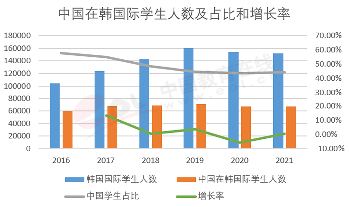 由于學(xué)費低廉,地理位置接近,申請容易,中國也是韓國第一大生源國,最高占到韓國國際學(xué)生人數(shù)接近六成。2016-2019年間增長迅速,受新冠疫情影響,2020年增長趨勢被打斷,但下降幅度不大,2021年有微幅增長。但即使在2017年,增長幅度高達兩位數(shù)的情況下,中國國際學(xué)生占韓國全體國際生人數(shù)的比例依然呈下降趨勢,不過仍占到韓國國際學(xué)生的四成。