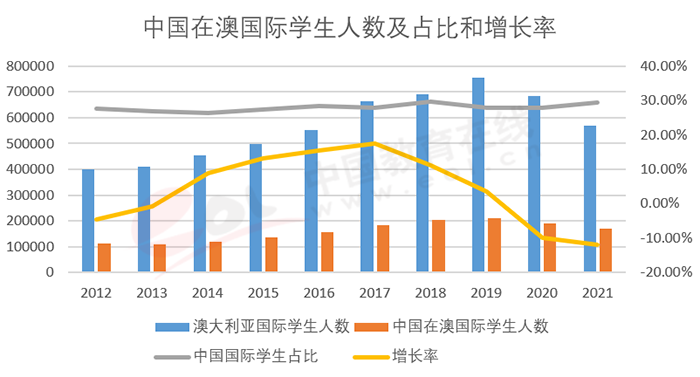 近十年,中國在澳國際學(xué)生人數(shù)總體呈上升趨勢,受疫情影響,澳大利亞2020年3月開始封鎖邊境,這導(dǎo)致中國赴澳留學(xué)人數(shù)連續(xù)兩年大幅下降,20年降幅達 10%,21年降幅進一步擴大,為12%。