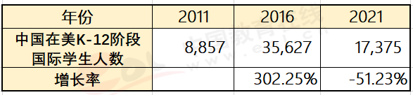 以中國國際學(xué)生人數(shù)總量最多的美國為例,疫情對低齡留學(xué)生的影響最大。根據(jù)美國移民和海關(guān)執(zhí)法局 (ICE)發(fā)布的2021 年SEVP年度報告數(shù)據(jù)顯示,從2020年到2021年,在美就讀 K-12 階段的國際學(xué)生人數(shù)減少了16%。而從2011年到2016年,中國在美就讀K-12階段的國際學(xué)生人數(shù)增長了302.25%,而到了2021年,相比2016年,小留學(xué)生人數(shù)下降了一半。