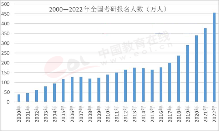 之所以就讀研究生人數(shù)再次超過本科生,和中國高校畢業(yè)生面臨的國內(nèi)就業(yè)升學(xué)壓力有關(guān)。當(dāng)下就業(yè)形勢困難,不少大學(xué)畢業(yè)生選擇升學(xué)來延緩就業(yè),考研報名人數(shù)迅速增長(見圖19)。2015年,研招報名人數(shù)177萬,到2019年,這個人數(shù)就接近翻了一番,達到341萬,而到2022年,考研報名人數(shù)高達457萬人,而考研招生計劃的增長趕不上報名人數(shù)的增長。隨著用人單位在招聘時要求的學(xué)歷門檻越來越高,不少學(xué)生選擇了出國深造。