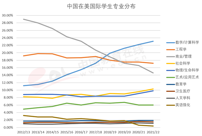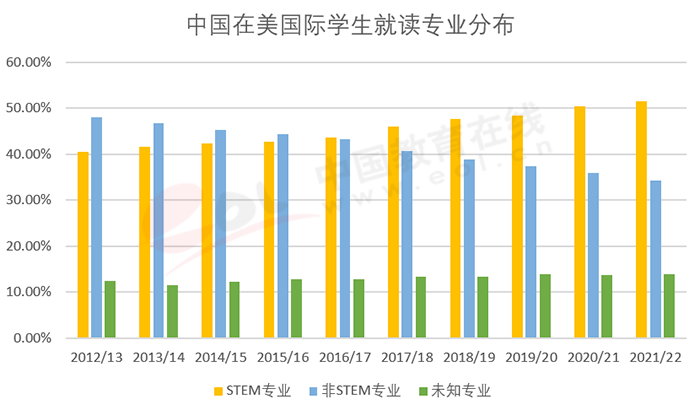 隨著選擇數(shù)學(xué)與計算科學(xué)專業(yè)人數(shù)的上升,在美就讀STEM類專業(yè)的中國國際學(xué)生人數(shù)也隨之上升,占比從2012/13學(xué)年的40.5%上升到2021/22學(xué)年的51.6%,漲幅達11%。