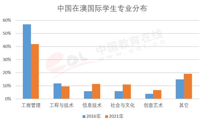 赴澳留學(xué)的中國學(xué)生選擇的排名前五的專業(yè)是工商管理、工程與技術(shù)、信息技術(shù)、社會與文化和創(chuàng)意藝術(shù),相較2016年,2020年,中國國際學(xué)生選擇工商管理專業(yè)的人數(shù)占比從57%大幅下降到41.8%,選擇信息技術(shù)和社會與文化的學(xué)生則從6%分別上升到11.4%和11%,創(chuàng)意藝術(shù)從4%上升到6.9%(見圖22)??傮w而言,選擇STEM專業(yè)的學(xué)生占比在不斷增加。