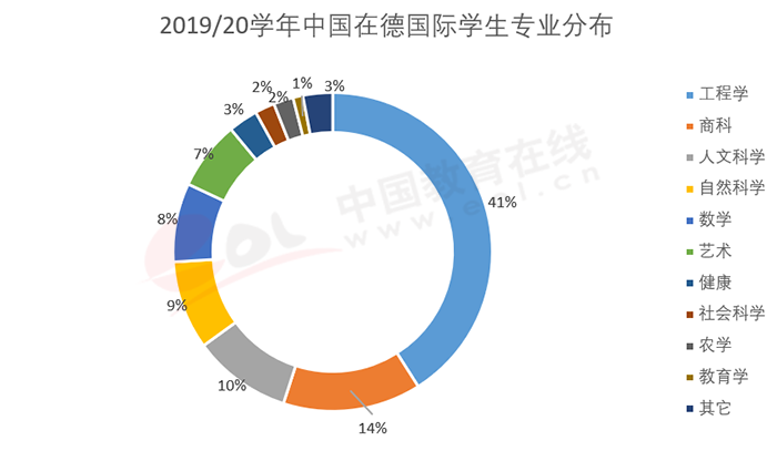 制造業(yè)強大的德國,工科是傳統(tǒng)優(yōu)勢學(xué)科,一直受到國際學(xué)生的歡迎。在德國的中國國際學(xué)生選擇的排名前五的專業(yè)是工程學(xué)、商科、人文科學(xué)、自然科學(xué)和數(shù)學(xué),位居第一的是工程學(xué),占比41%,加上自然科學(xué)、數(shù)學(xué)與農(nóng)學(xué),正好為60%;選擇人文科學(xué)和社會科學(xué)的學(xué)生合計約占比為24%,比2016年下降了9個百分點。特別要說一下的是,藝術(shù)專業(yè)雖然沒能排進前五,但也是中國學(xué)生的熱門選擇,占比也呈上升趨勢。