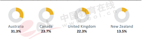 總體而言,美國、英國和澳大利亞等英語國家以及少數(shù)歐洲發(fā)達國家在吸引國際學(xué)生方面仍占據(jù)領(lǐng)先優(yōu)勢。除美國外,排名前十的其它主要英語國家——澳大利亞、加拿大和國的國際學(xué)生占本國高等教育學(xué)生比例都超過20%,位居全球前,如圖2所示,依次為澳大利亞31.3%,加拿大23.7%,英國22.3%,而另一個英語國家新西蘭則位居第四,國際學(xué)生占本國高等教育學(xué)生比例為13.5%。
