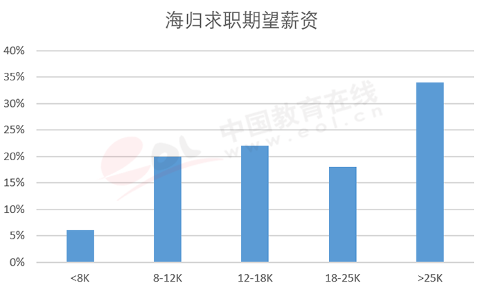 由于中國留學(xué)生群體以自費留學(xué)為主,在教育階段投入巨大,因此在求職時,對薪金的期望值往往偏高。據(jù)領(lǐng)英發(fā)布的2022 年《中國留學(xué)生歸國求職洞察報告》數(shù)據(jù),半數(shù)以上的海歸求職者,期望薪金在18000元以上,超過1/3的求職者期望薪金在25000元以上。