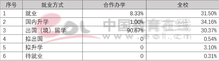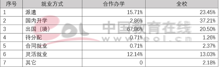 中外合作辦學(xué)項目就業(yè)統(tǒng)計數(shù)據(jù)顯著向好,就業(yè)率和就業(yè)質(zhì)量持續(xù)提升,如表9、表10所示,尤其在出國(境)升學(xué)方面具有突出優(yōu)勢,畢業(yè)生多數(shù)進入國(境)外一流高校深造。