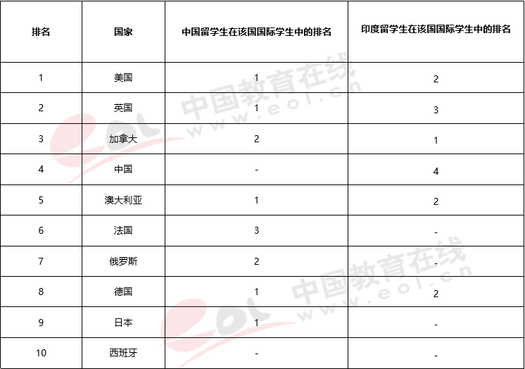 值得一提的是,2018年開始,印度出國留學(xué)人數(shù)增長非常迅猛,在多個主要留學(xué)目的國的國際學(xué)生人數(shù)已接近中國,在加拿大甚至超過了中國,位居第一。(見表2)。