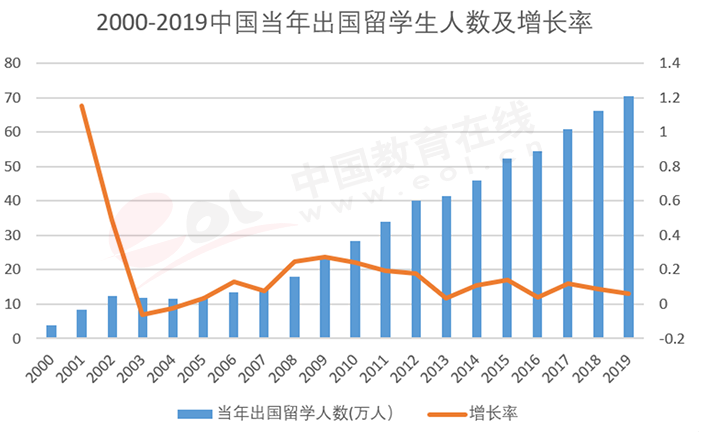 中國出國留學(xué)人數(shù)進入二十一世紀以來,增長迅猛,從2000年的3.9萬人到2019年的70.35萬人,增長了接近18倍,2001-2002年度和2008-2012年度增幅最快,近兩年有所放緩,2019年度增長率為6.25%(見圖5)。