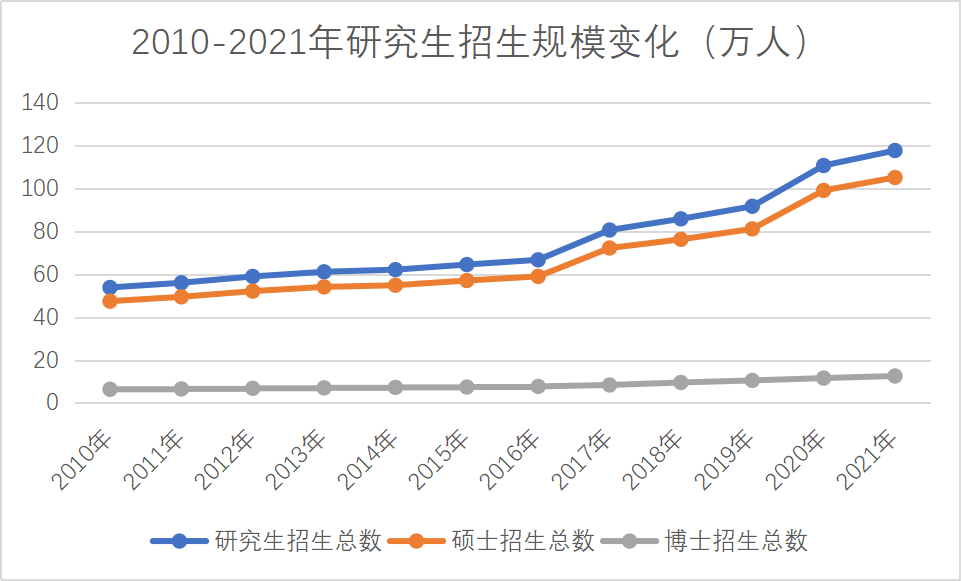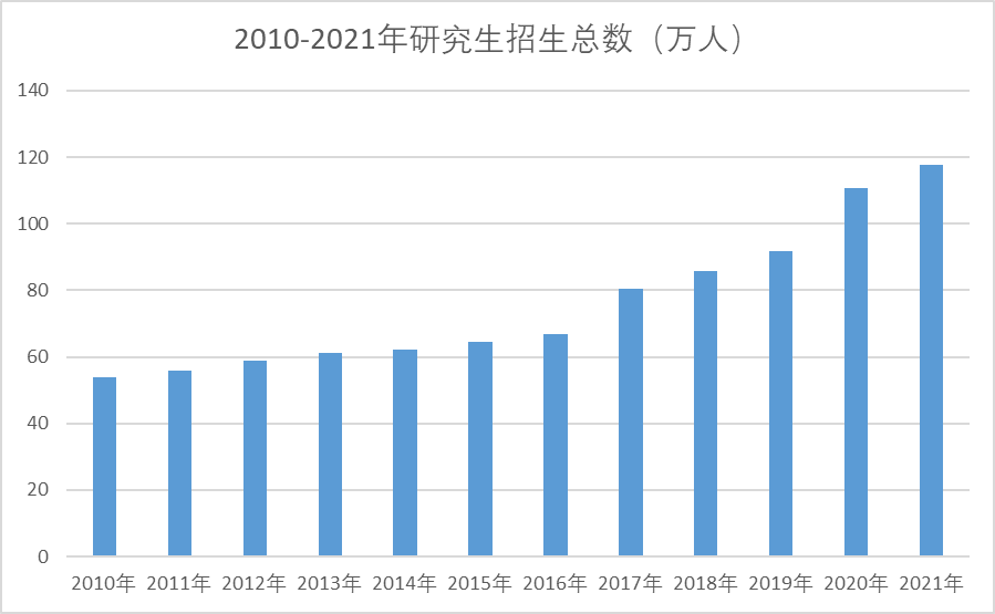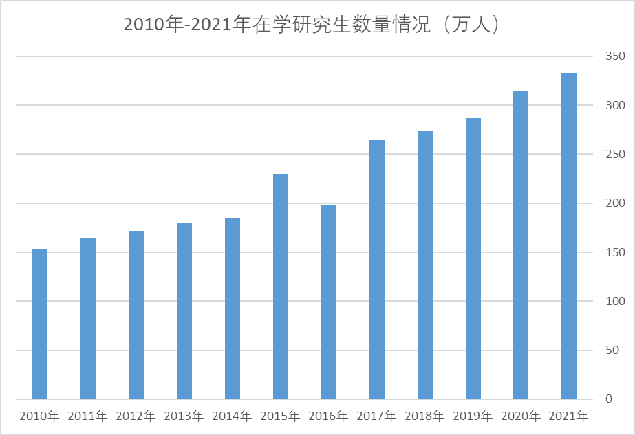 根據(jù)最新數(shù)據(jù),2021年全國(guó)共有在學(xué)研究生333.2萬(wàn)人,對(duì)比2010的153.8萬(wàn),增加了179.4萬(wàn)人,增幅超過一倍多。