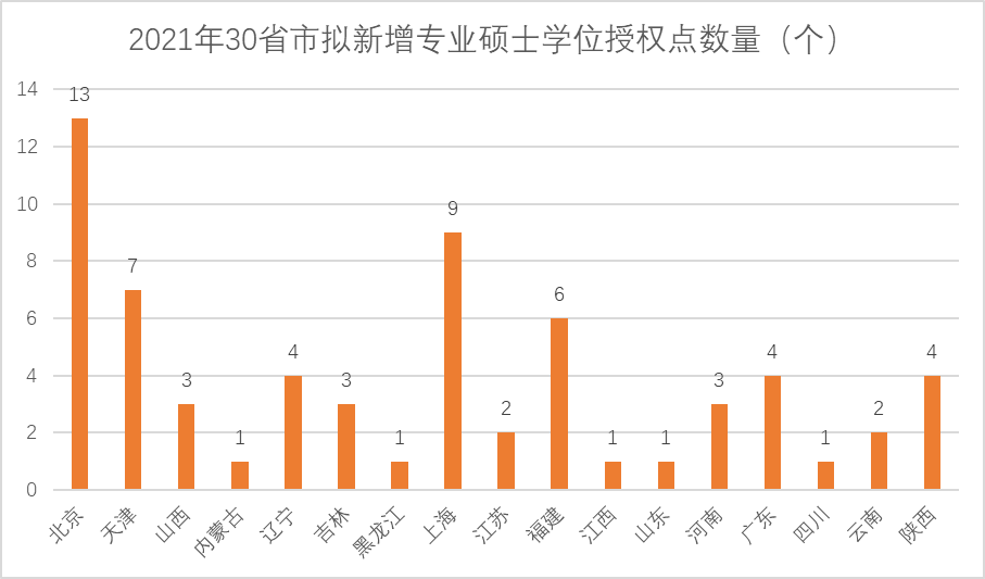 綜合學(xué)位授權(quán)自主審核單位及動(dòng)態(tài)調(diào)整增列學(xué)位授權(quán)點(diǎn)數(shù)據(jù),2021年全國(guó)新增學(xué)位授權(quán)點(diǎn)(分?。┲校本┦性隽袑I(yè)碩士學(xué)位授權(quán)點(diǎn)數(shù)量最多,增列學(xué)位授權(quán)點(diǎn)13個(gè);其次是上海市,增列學(xué)位授權(quán)點(diǎn)9個(gè)。