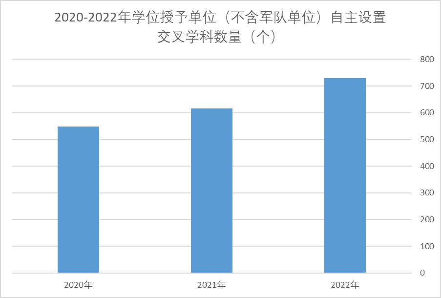 此外,自主設(shè)置交叉學(xué)科數(shù)量也在不斷增長(zhǎng)。2022年我國(guó)學(xué)位授予單位(不含軍隊(duì)單位)自主設(shè)置交叉學(xué)科數(shù)量為729個(gè),同比增長(zhǎng)18%。