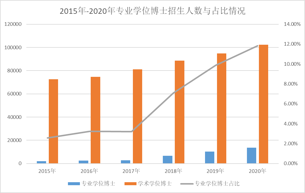 根據(jù)教育部公布數(shù)據(jù),隨著大力度推進(jìn)專業(yè)學(xué)位博士研究生的培養(yǎng),2021年專業(yè)學(xué)位博士招生比例已達(dá)到14.4%。