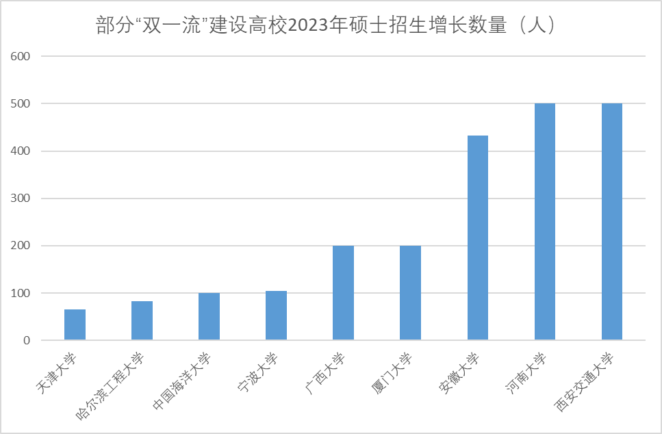 總體來看,多數(shù)高校碩士研究生招生規(guī)模不斷擴(kuò)大,部分學(xué)校增長(zhǎng)幅度較大。與2022年全國(guó)碩士研究生招生計(jì)劃相比,2023年“雙一流”高校招生計(jì)劃均明顯增長(zhǎng)。其中,西安交通大學(xué)2023年計(jì)劃招收碩士研究生7500人,相比2022年增加招生計(jì)劃500人。