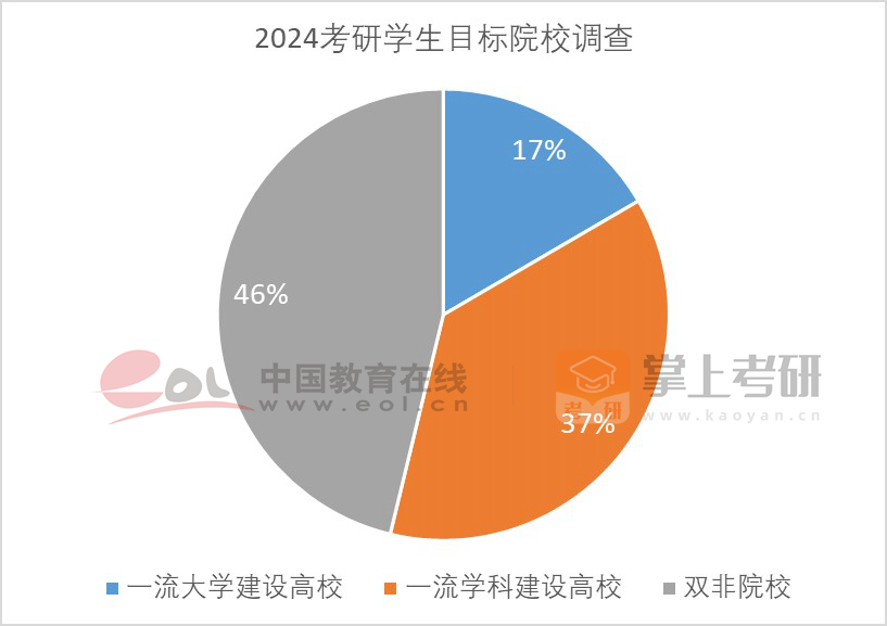 此外,根據(jù)中國教育在線開展的2024年考研學生問卷調(diào)查顯示,近五成受訪者目標院校為雙非院校,目標院校為一流學科建設(shè)高校的占比為37%,目標為一流大學建設(shè)高校的占比不足兩成。