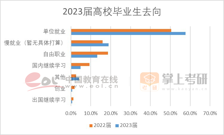 此外,根據(jù)智聯(lián)招聘發(fā)布的《2023大學生就業(yè)力調(diào)研報告》顯示, 2023屆畢業(yè)生選擇單位就業(yè)的比例從去年的50.4%上升到57.6%;選擇自由職業(yè)的比例從去年的18.6%下降到13.2%;選擇國內(nèi)繼續(xù)學習的比例從去年的9.3%下降到4.9%。