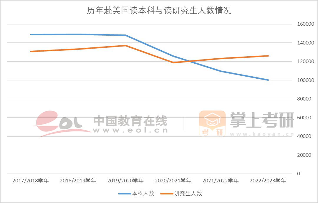 根據(jù)美國國際教育協(xié)會和美國國務(wù)院教育與文化事務(wù)局發(fā)布的《2023年度美國門戶開放報告》顯示,中國大陸依舊是美國國際生最大生源地。2022-2023學年中國大陸留學生赴美讀研究生學位的人數(shù)為126028人,占中國大陸赴美留學生總數(shù)的43.52%,占比上升2.3%。赴美讀研人數(shù)雖然沒有回到疫情前水平,但已經(jīng)率先迎來反彈,并與赴美讀本科學位的人數(shù)進一步拉大。