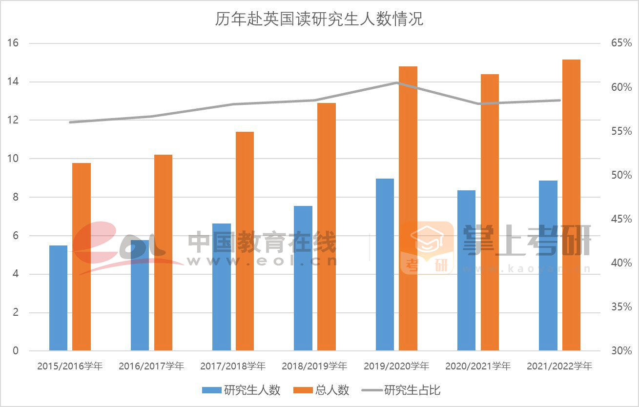此外,根據(jù)英國高等教育統(tǒng)計局數(shù)據(jù)顯示, 2021/22學年,中國內(nèi)地赴英就讀人數(shù)超過15萬人,其中研究生人數(shù)為8.87萬人,占比為58.51%,研究生人數(shù)同比上一年度增長了6.01%。從近年赴英讀研人數(shù)占比情況看,研究生及以上人群仍然是中國內(nèi)地學生留學英國的主體。