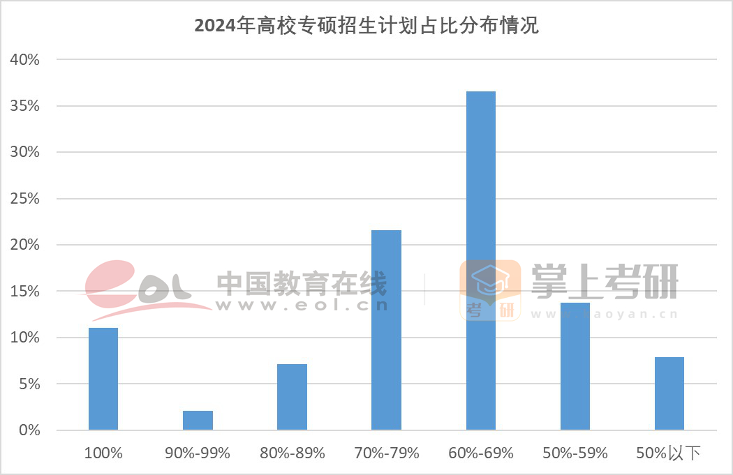 通過對今年662所高校(不含科研院所及黨校)碩士研究生統(tǒng)招計劃(不含推免計劃)統(tǒng)計,只招收專碩的院校占比為11.03%,統(tǒng)招專碩計劃占比在60%以上的院校占比為78.4%,接近八成。而統(tǒng)招專碩計劃占比在50%以下的院校占比僅為7.85%。