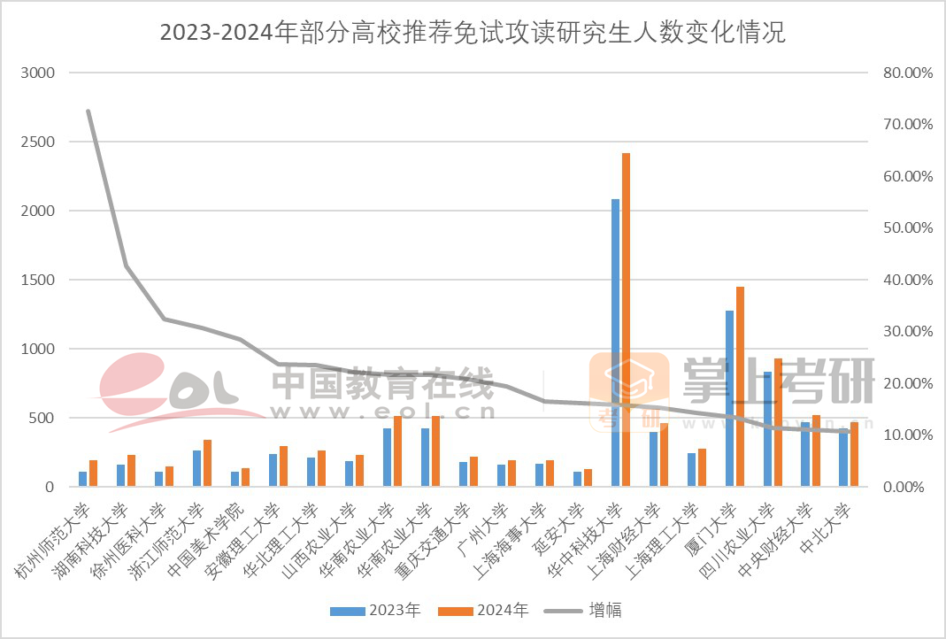近年來,推免生受到高校與廣大研究生導(dǎo)師的歡迎,部分院校的推免招生數(shù)量也伴隨招生總量的增長,呈現(xiàn)出不斷增長趨勢。其中,雙非院校保研名額因為基數(shù)較低,增幅更加明顯。杭州師范大學今年保研名額195人,較去年增加82人,增幅達到了72.57%。湖南科技大學今年保研名額234人,較去年增加70人,增幅達到了42.68%。