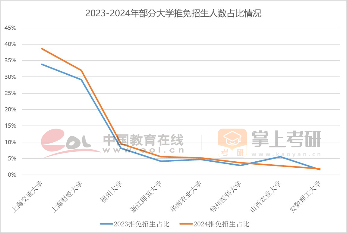 伴隨招生總量增長,推免生招生規(guī)模進一步擴大,但推免生占總體招生計劃的比例保持平穩(wěn),并未出現(xiàn)明顯增長,教育部對高校接收推免生設(shè)置了不能超過招生計劃50%的紅線。此外,不同高校之間,推免生招生占比差異較大。