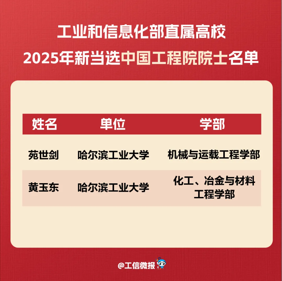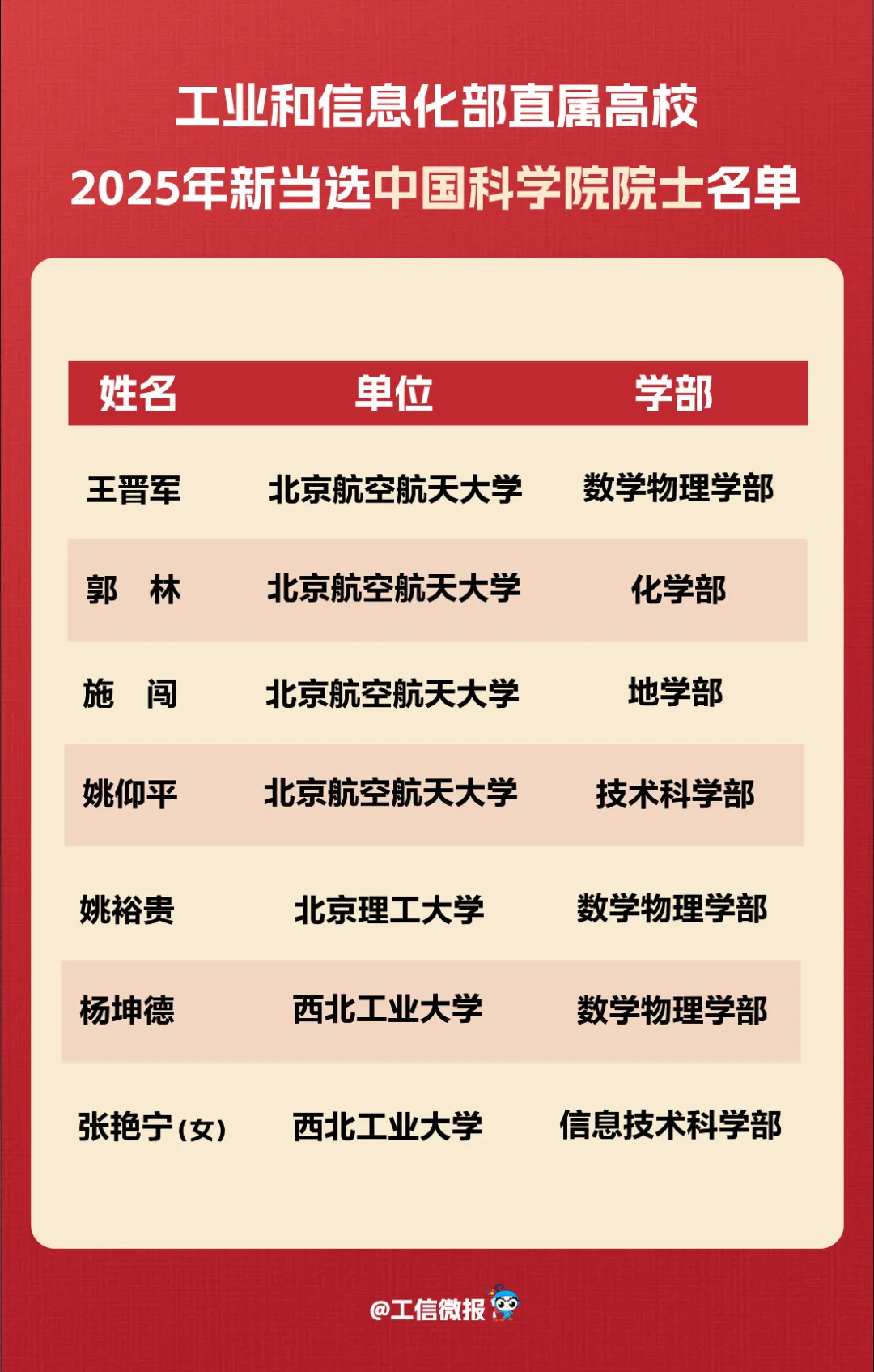 11月21日,中國科學(xué)院、中國工程院公布2025年院士增選結(jié)果,分別選舉產(chǎn)生中國科學(xué)院院士73人、中國工程院院士71人。工業(yè)和信息化部直屬高校共9人當(dāng)選中國科學(xué)院、中國工程院院士,名單如下: