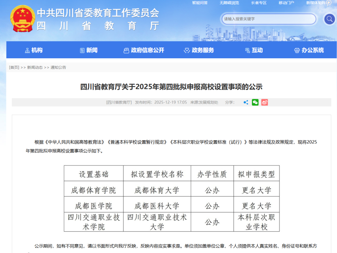 12月19日,四川省教育廳發(fā)布《關(guān)于2025年第四批擬申報高校設(shè)置事項的公示》。