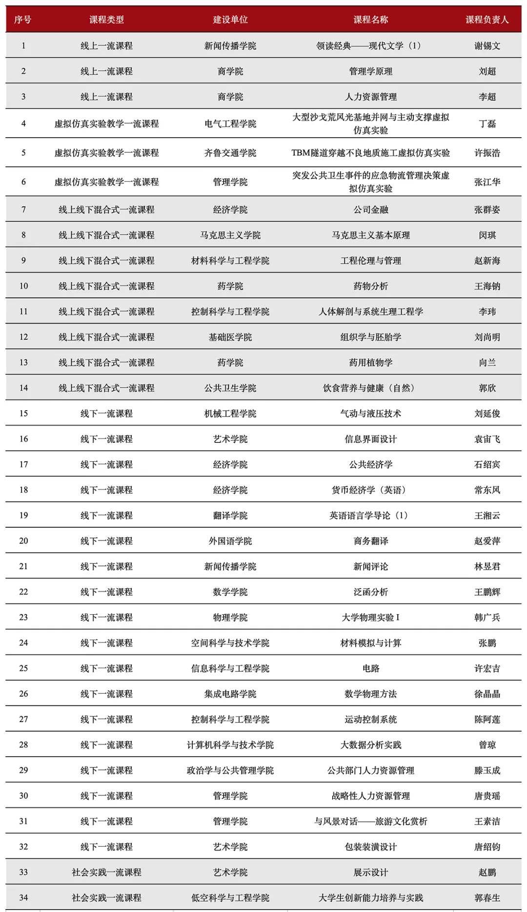 近日,教育部公布了第三批國家級一流本科課程認定結(jié)果名單。山東大學(xué)共有34門課程入選,包括線下課程18門、線上課程3門、線上線下混合式課程8門、虛擬仿真實驗教學(xué)課程3門,以及社會實踐課程2門。