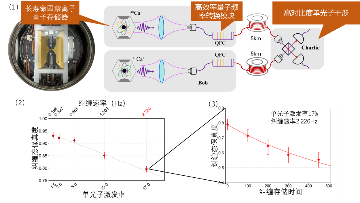圖3. 可擴展量子中繼的基本模塊原理圖。(1)實驗由長壽命囚禁離子量子儲存器、高效率量子頻率轉(zhuǎn)換模塊與高對比度單光子干涉模塊組成。(2)糾纏建立速率為2.226赫茲,即等待時間約450毫秒。(3)糾纏壽命約550毫秒。