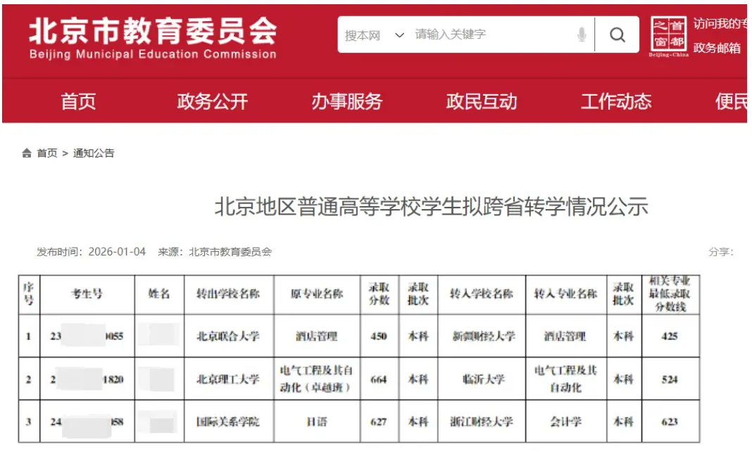 北京地區(qū)普通高等學(xué)校學(xué)生擬跨省轉(zhuǎn)學(xué)情況公示(圖源:北京市教委官網(wǎng)-2024年1月2日)
