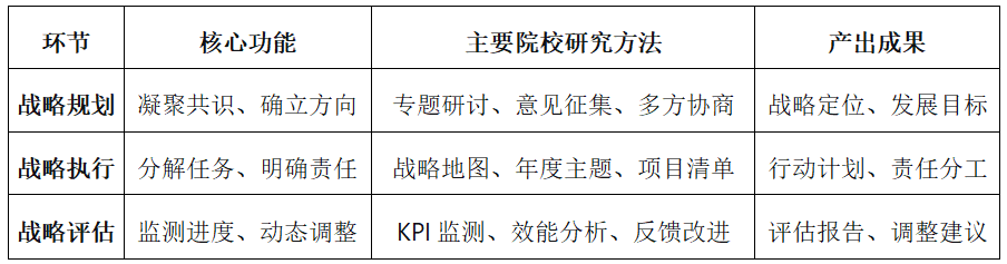 在“共同創(chuàng)造”模式中,戰(zhàn)略引領(lǐng)機(jī)制是實(shí)現(xiàn)院校研究從被動響應(yīng)向主動引領(lǐng)轉(zhuǎn)變的核心環(huán)節(jié)。該機(jī)制通過IR的專業(yè)介入與多元主體的協(xié)同參與,構(gòu)建了從戰(zhàn)略生成、傳導(dǎo)到評估的完整閉環(huán),形成了“證據(jù)驅(qū)動、全員參與、持續(xù)優(yōu)化”的戰(zhàn)略治理新范式。