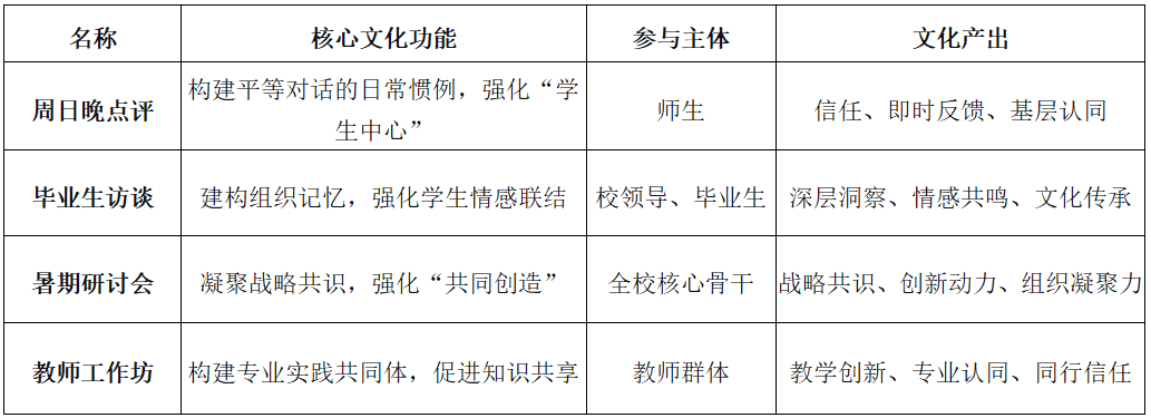 文化賦能機(jī)制構(gòu)成“共同創(chuàng)造”模式的深層支撐,通過系統(tǒng)化的文化建構(gòu)與制度性交流實(shí)踐,營造尊重專業(yè)價(jià)值、激勵協(xié)同創(chuàng)新的組織氛圍。時任校長劉獻(xiàn)君高度重視文化在院校研究中的基礎(chǔ)性作用,提出“共同目標(biāo)、共同創(chuàng)造、共同發(fā)展”的組織文化,在他的推動下,文華學(xué)院建立了包括“周日晚點(diǎn)評”、“畢業(yè)生深度訪談”等在內(nèi)的制度性交流體系,為“共同創(chuàng)造”模式提供了深厚的文化支撐。