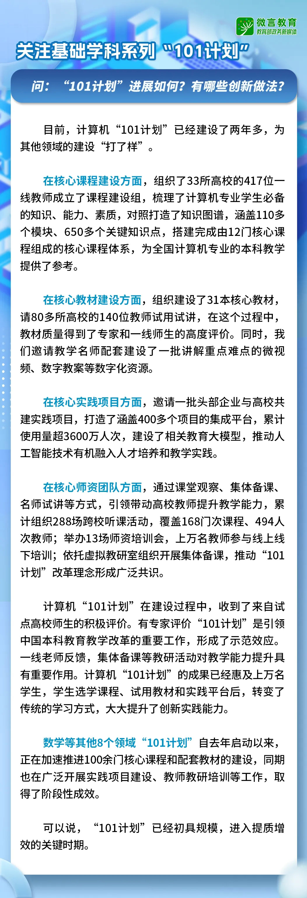 近日,基礎(chǔ)學(xué)科系列“101計(jì)劃”工作推進(jìn)會暨計(jì)算機(jī)“101計(jì)劃”成果交流會在京召開,明確相關(guān)重點(diǎn)任務(wù)。基礎(chǔ)學(xué)科系列“101計(jì)劃”究竟是什么?為什么叫“101計(jì)劃”?瞄準(zhǔn)的目標(biāo)是什么?有哪些創(chuàng)新做法?一組大圖帶你了解——