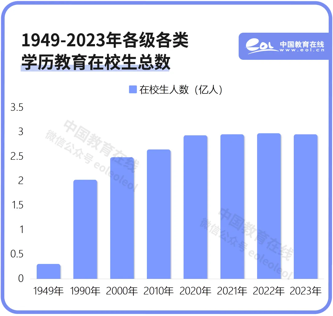 2023年,據(jù)教育事業(yè)統(tǒng)計(jì)數(shù)據(jù)顯示,全國(guó)共有各級(jí)各類(lèi)學(xué)校49.83萬(wàn)所,有2.91億學(xué)歷教育在校生,占人口總數(shù)的20.6%。