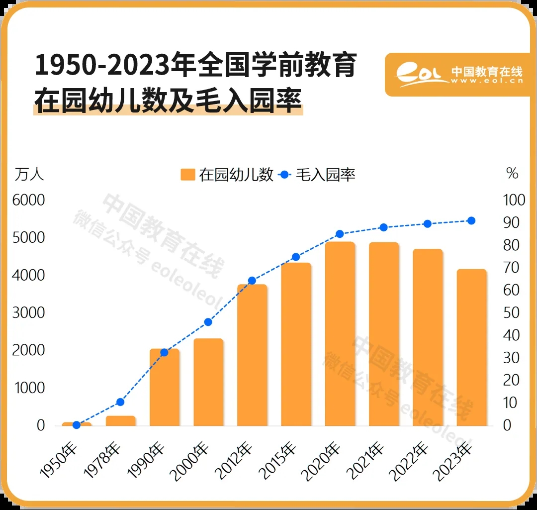 在園幼兒數(shù)從14萬(wàn)人增加到2023年的4093萬(wàn)人。